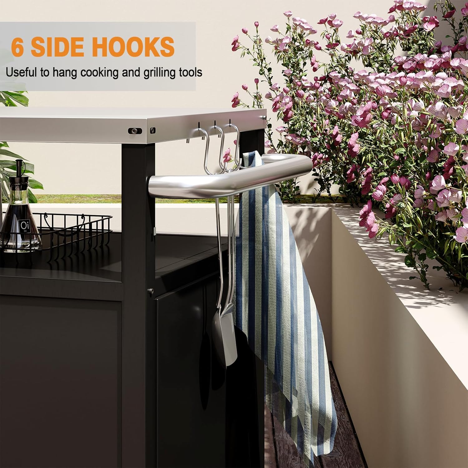 - Outdoor Grilling Equipment Addition Equipped with 2 wheels and a handle, this cart is highly convenient for outdoor grilling. You can easily wheel it inside for food preparation and then move everything outside for cooking, making the entire process much simpler. The table can be used for BBQing, grilling, and even as a pizza oven stand table. The six hooks provided are very useful for hanging cooking and grilling tools, ensuring they are always within arm's reach when needed.
