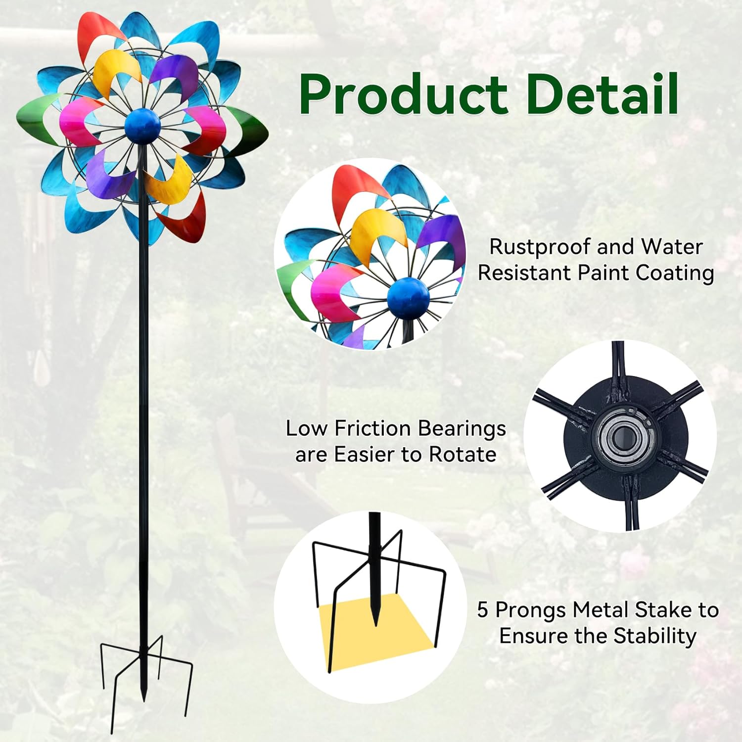 - Vibrant Colorful Outdoor Wind Spinner: This large kinetic wind spinner features two blades with a six color design, creating a dazzling display of vibrant colors when it rotates. Watch it spin and bring your yard to life with every breeze.