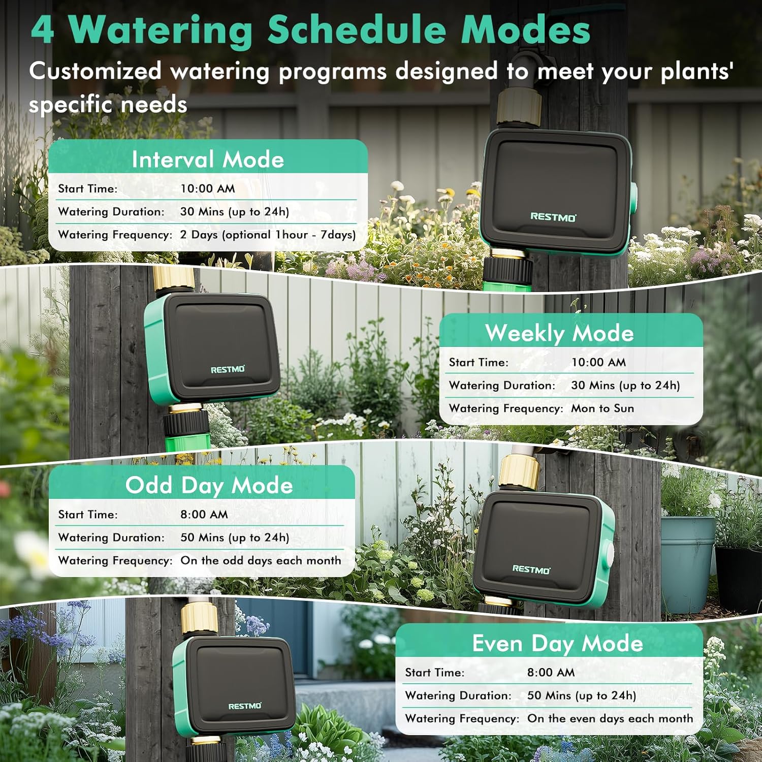 - 【Fully Customizable Plans】Customize watering plans with 4 flexible modes: Interval (1hr-7day frequency), Weekly, Odd Day, or Even Day. Set up to 8 independent schedules per zone with precise start times, durations (1min-24hrs), and frequencies to meet diverse plant needs. Whether for daily lawn care or monthly flower bed maintenance, the intuitive interface lets you tailor irrigation effortlessly.