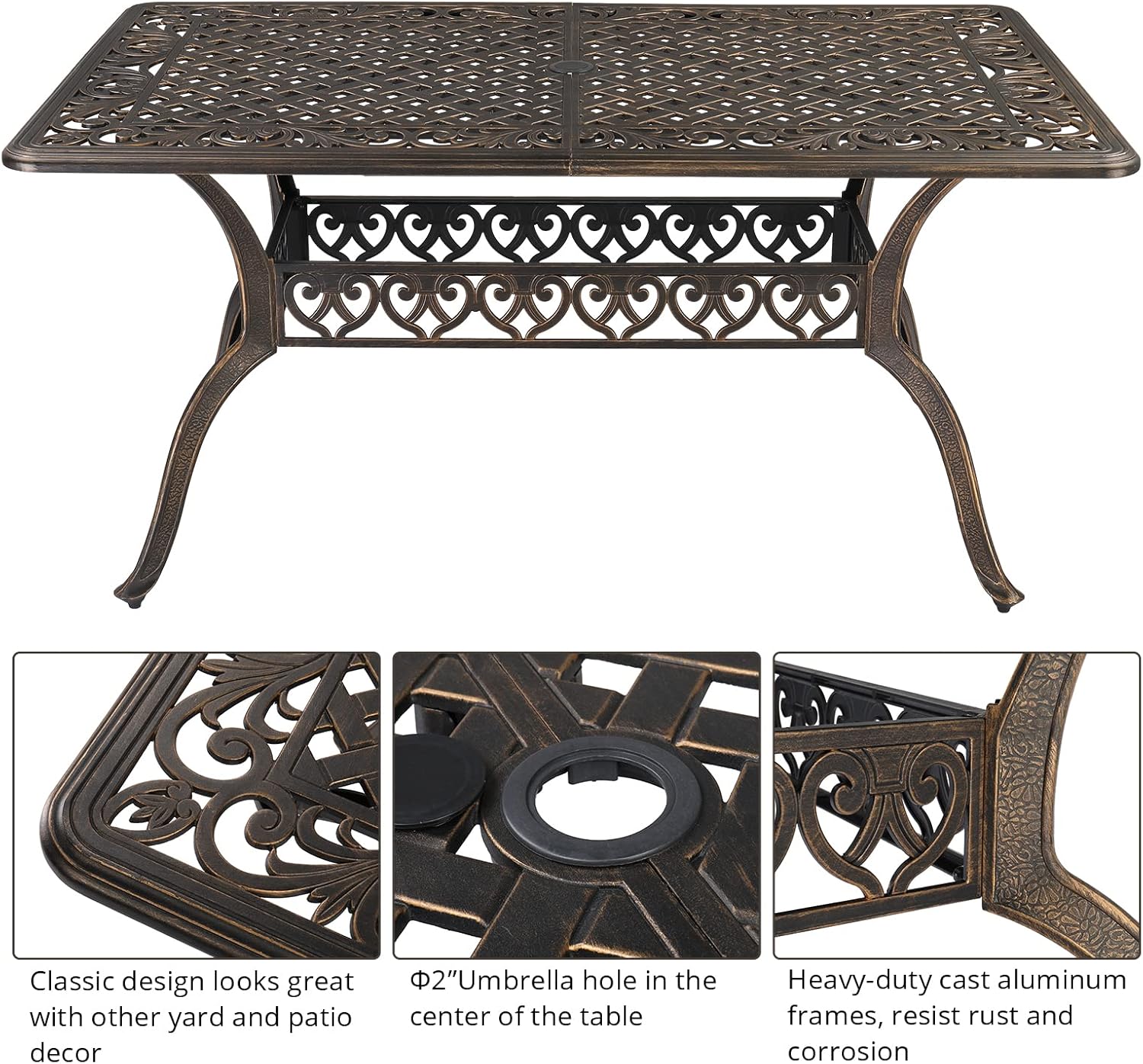 Outvita 59inch Patio Dinning Set, Outdoor Cast Aluminum Large Rectangle Table with Umbrella Hole and 6 Pieces Dining Chairs with Cushion for Backyard Pool Balcony Deck