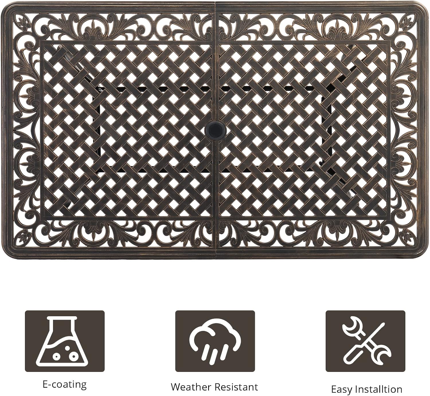 - Spacious and durable: This 35.4" x 59" cast aluminum dining table has a spacious tabletop space and can easily accommodate 6 people. It is an ideal choice for outdoor gatherings. The sturdy cast aluminum material is durable and can withstand wind and rain, accompanying you through every wonderful time