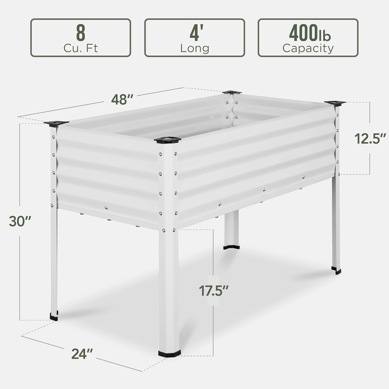 - FOR ALL GARDENERS: Whether you're a beginner or an experienced gardener, this bed is a sturdy and sustainable space to explore the hobby with a comfortable height and corner protectors/accessory holders-ideal for all ages and physical abilities; OVERALL DIMENSIONS: 48"(L) x 24"(W) x 30"(H); FILL CAPACITY: 400 lbs. 8 cu ft Planting Space