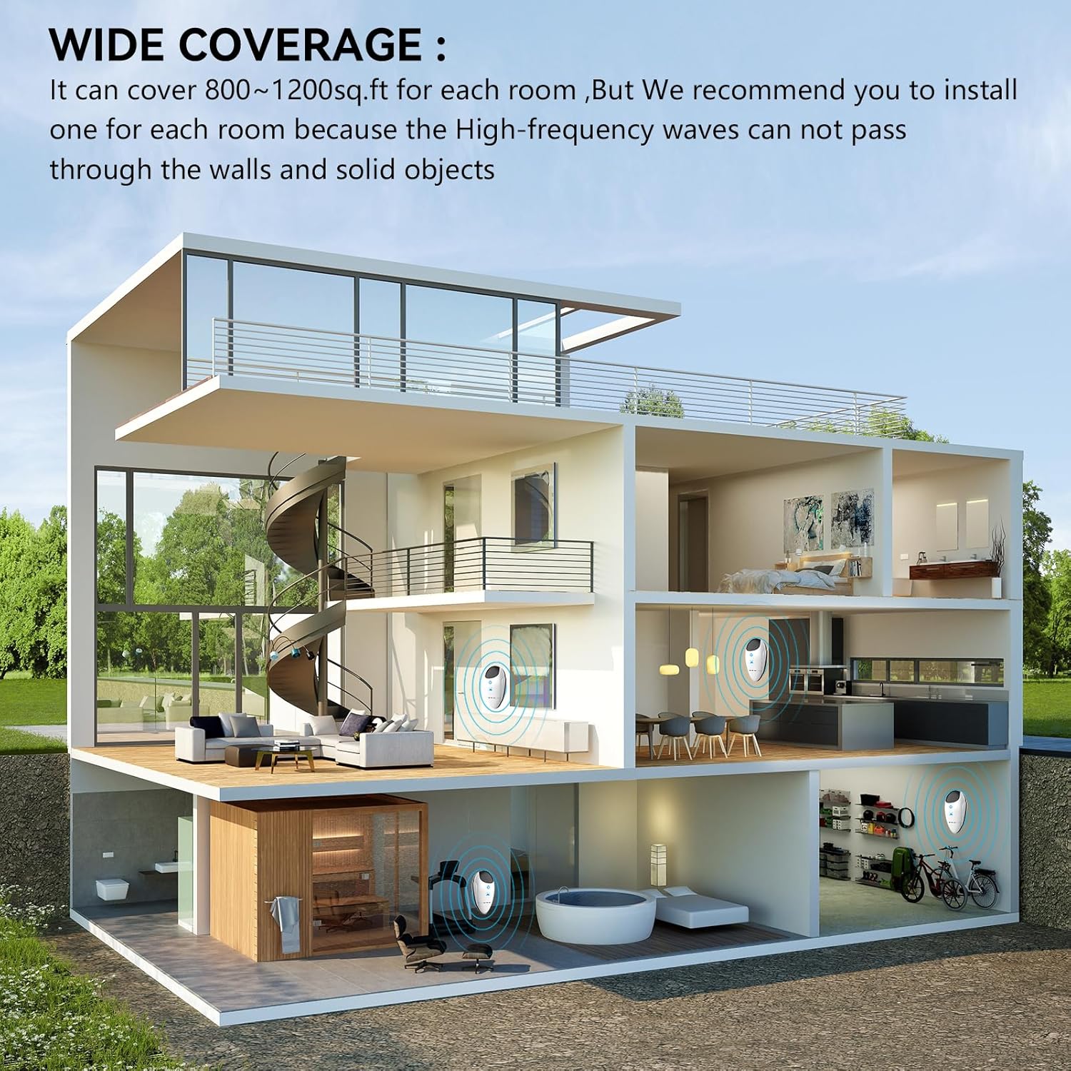 - Wide Coverage Area: Effective in areas up to 800-1200 square feet, this device works best in open spaces. For optimal results, use one unit per room, as ultrasonic waves do not penetrate walls.