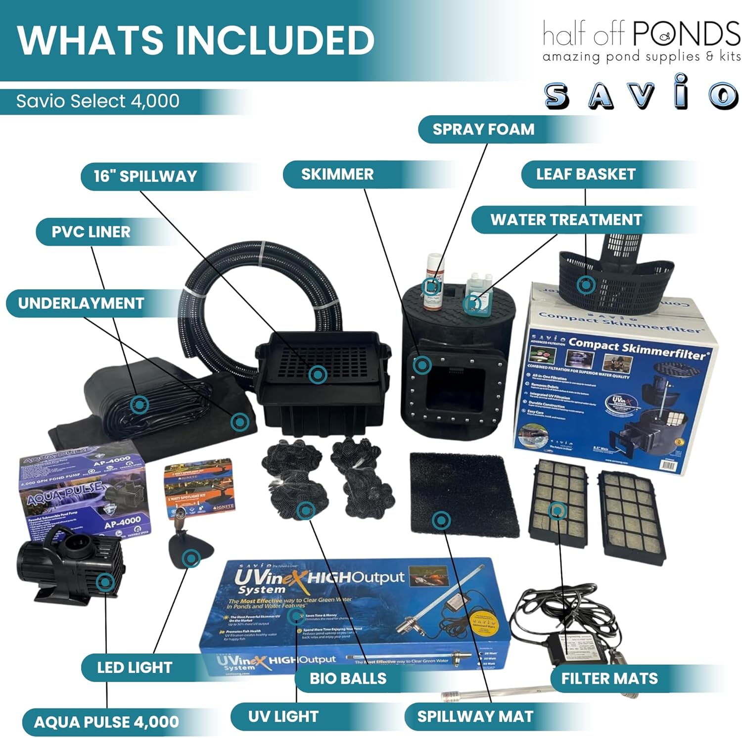 HALF OFF PONDS Savio Select 4,000 GPH Submersible Pump Pond Kit with 20' x 20' PVC Plastic Pond Liner, UV Clarifier for Water Garden & Koi Pond