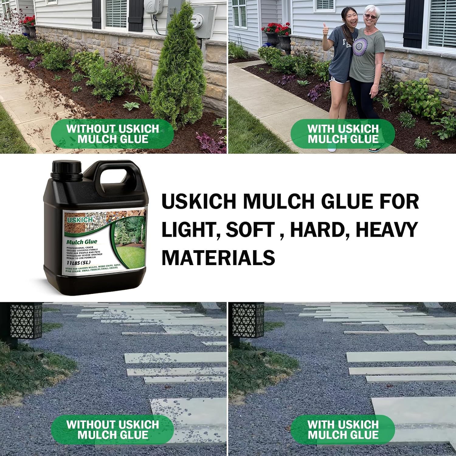 - LONG-LASTING AND EFFECTIVE: USKICH mulch Gravel glue for landscaping dries quickly, provides full protection for up to 12 - 24 months. You can say goodbye to messy cleanup for a long time.