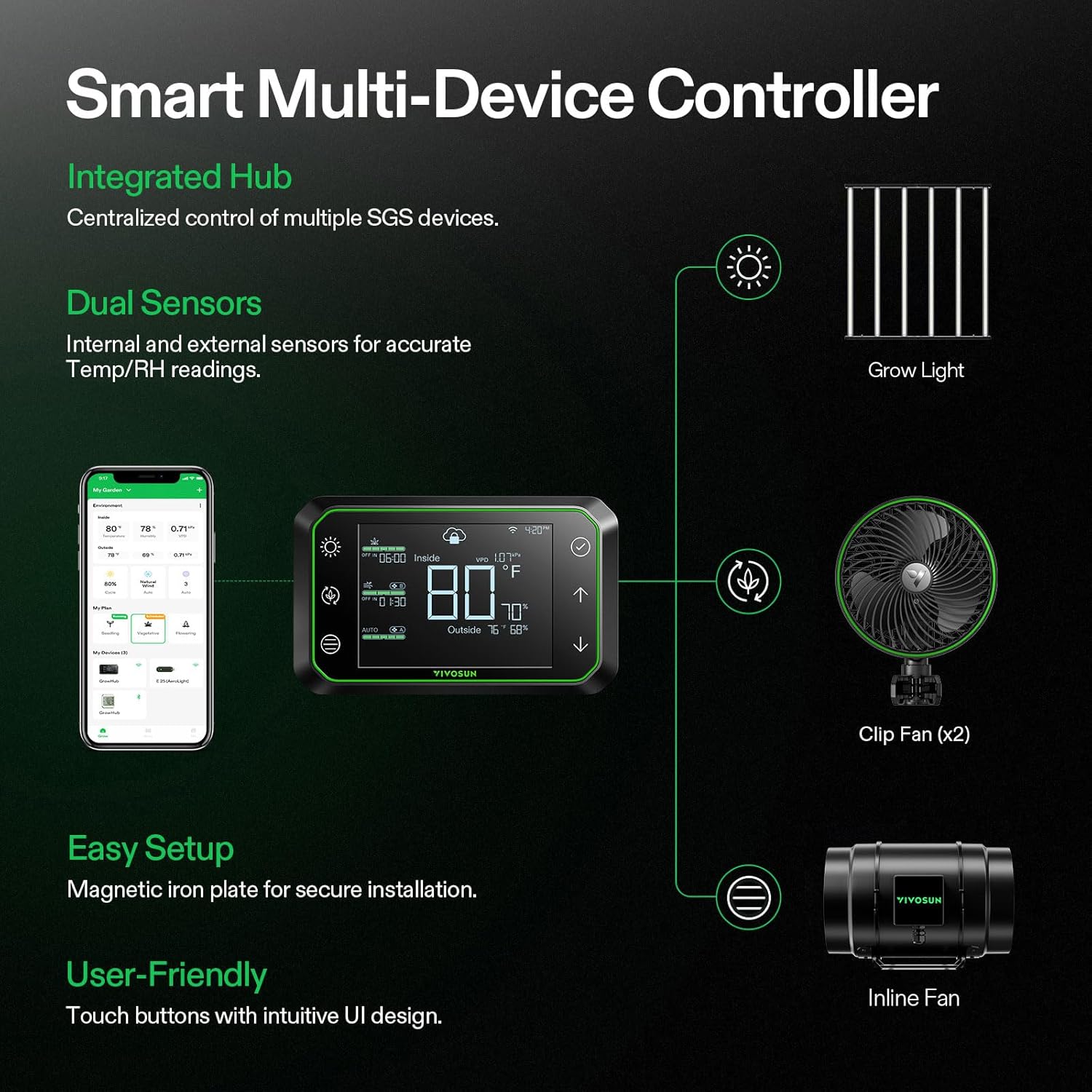 - Environmental Monitoring: With a built-in temperature and humidity gauge and one probe, the GrowHub Controller E42A monitors both internal and external conditions; You can view data and adjust settings effortlessly through the app