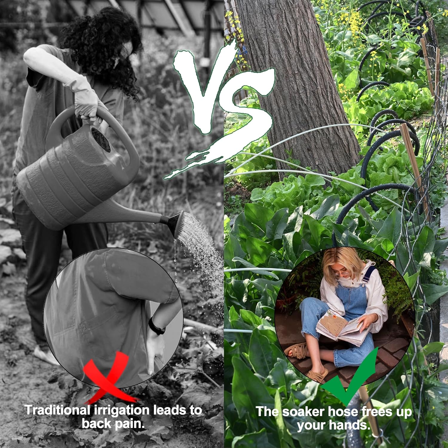 - 【Customizable Soaker Hose Kits】Different from the single soaker hose in the market, the kit comes with garden hose and fittings, which is a customizable soaker hose system. You don't have to worry about the length of your soaker hose or need to buy garden hose again, just connect the garden hose to the faucet and soaker hose to have the flexibility to design it according to your plan. Suitable for all yard types. It takes less than half an hour to assemble and is easy to water in all seasons.