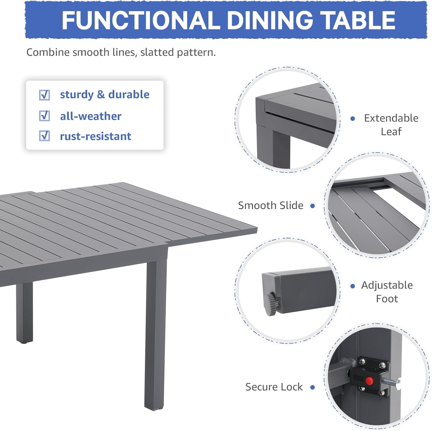 - ăWIDE APPLICATIONă: With its extension design and quality aluminum, the extendable outdoor dining table conveniently expands to make it easy for you to add extra seats when needed. Perfect for hosting, either using the expandable table as your main dining table or as a serving table for larger events.