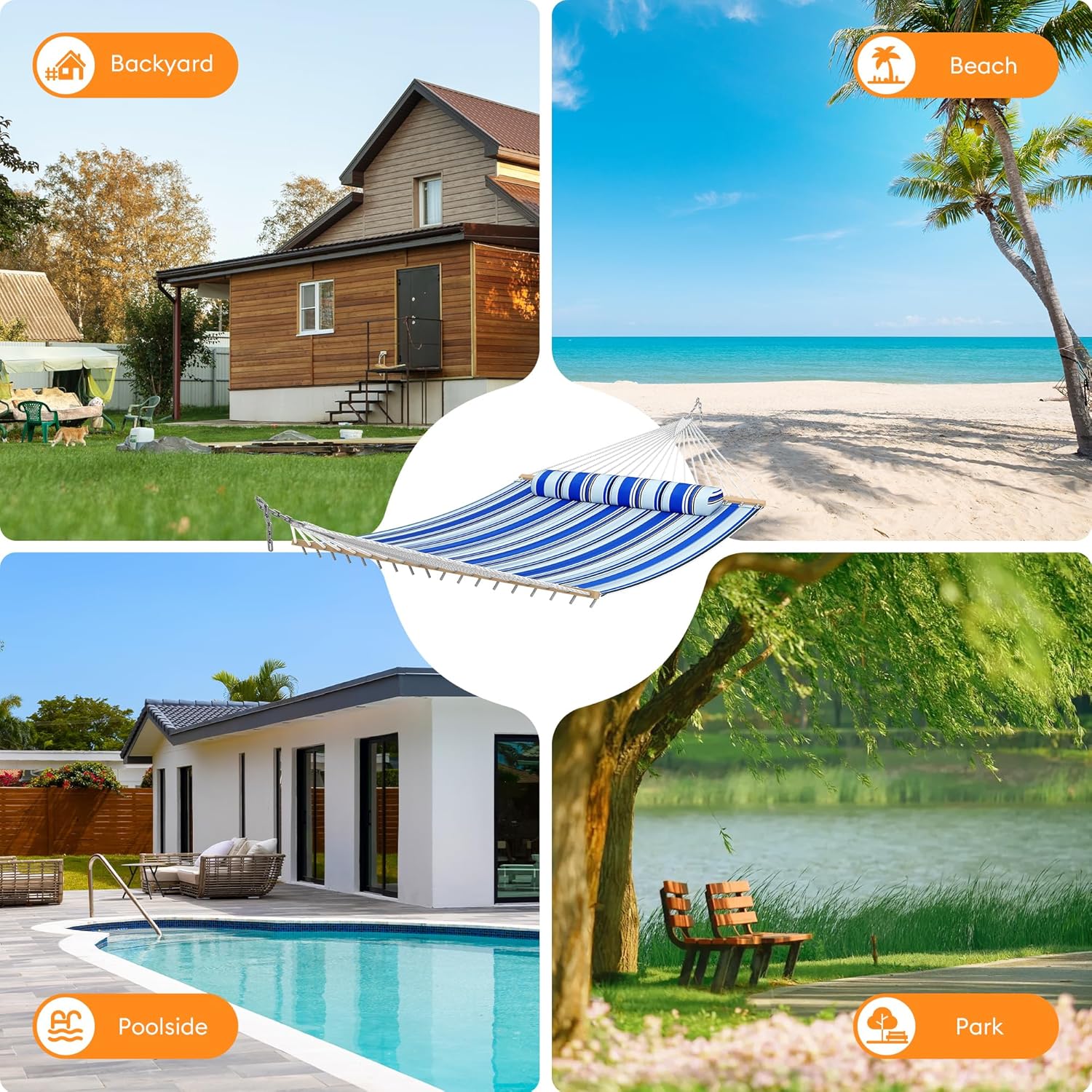 Double Hammock with Spreader Bar,Soft Pillow,Max Load 500lbs,Portable Hammock for Outdoor,Camping,and Backyard,Blue