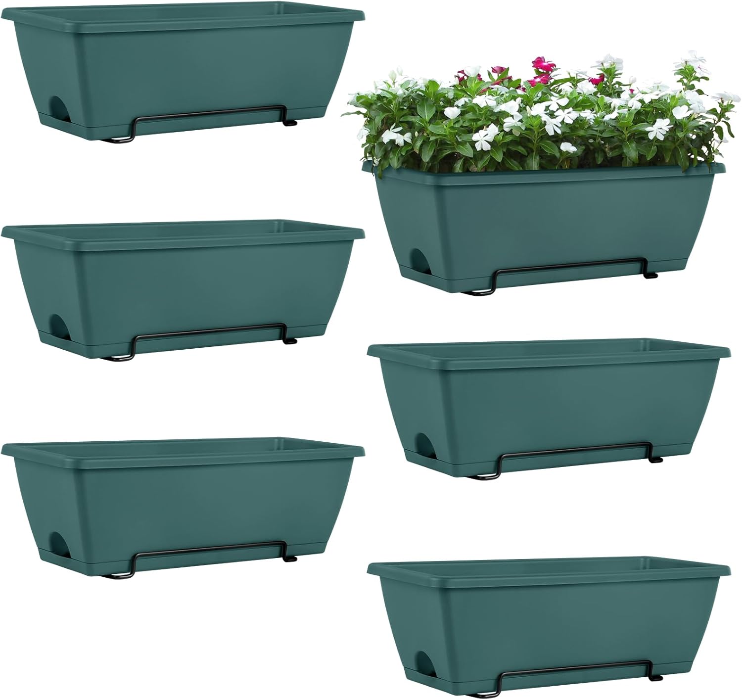 HAITRAL Railing Planter Boxes (16.9 Inch, 6 Pack) Green Plastic Deck Rail Planters for Outdoor Plants, Hanging Window Boxes with Drainage Tray for Over Rail Porch Fence,Balcony & Home Decor