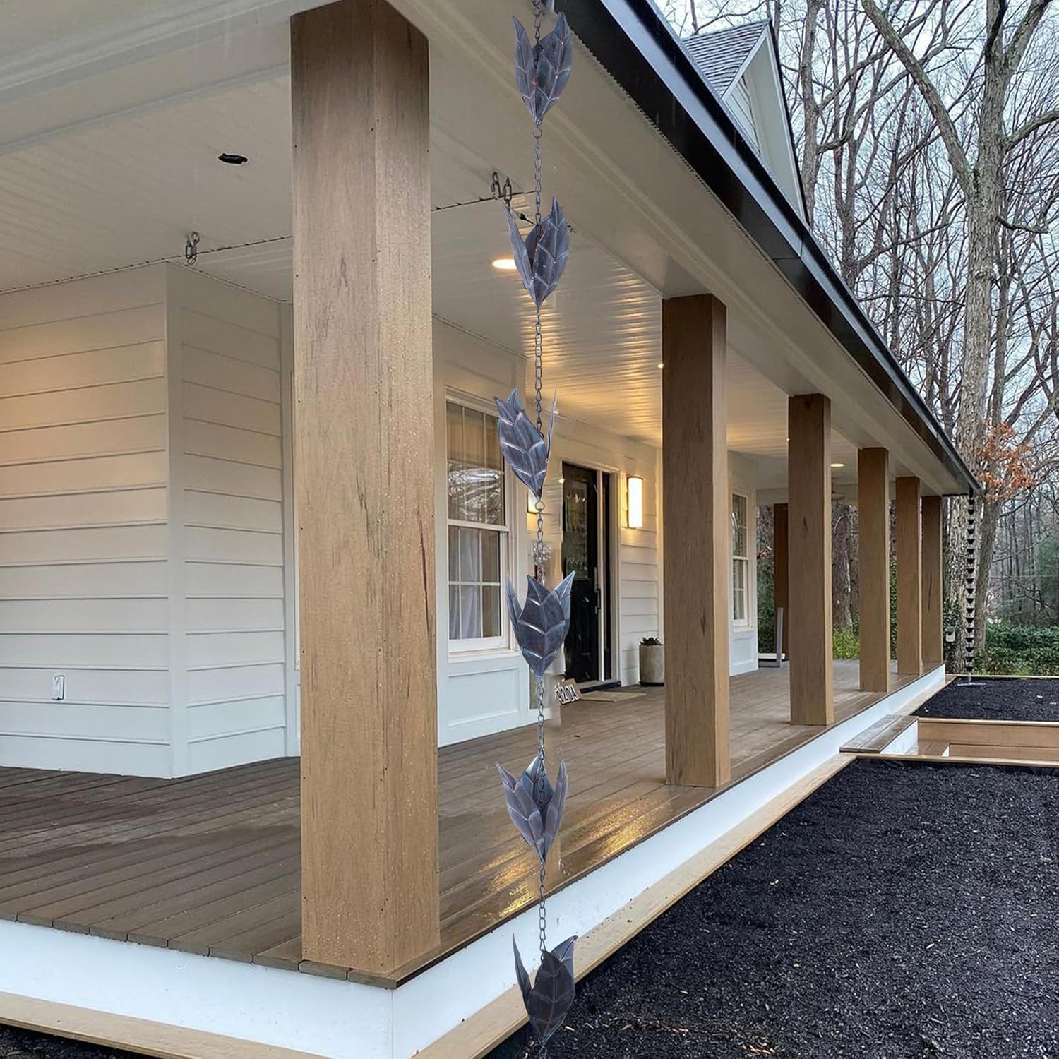 - 【Appearance of The Rain Chain】This rain chain can be used to decorate any of your outdoor scenes, including garden, balcony, veranda, and has a retro ornate look, the length is about: 112 inches, the length can be adjusted by removing