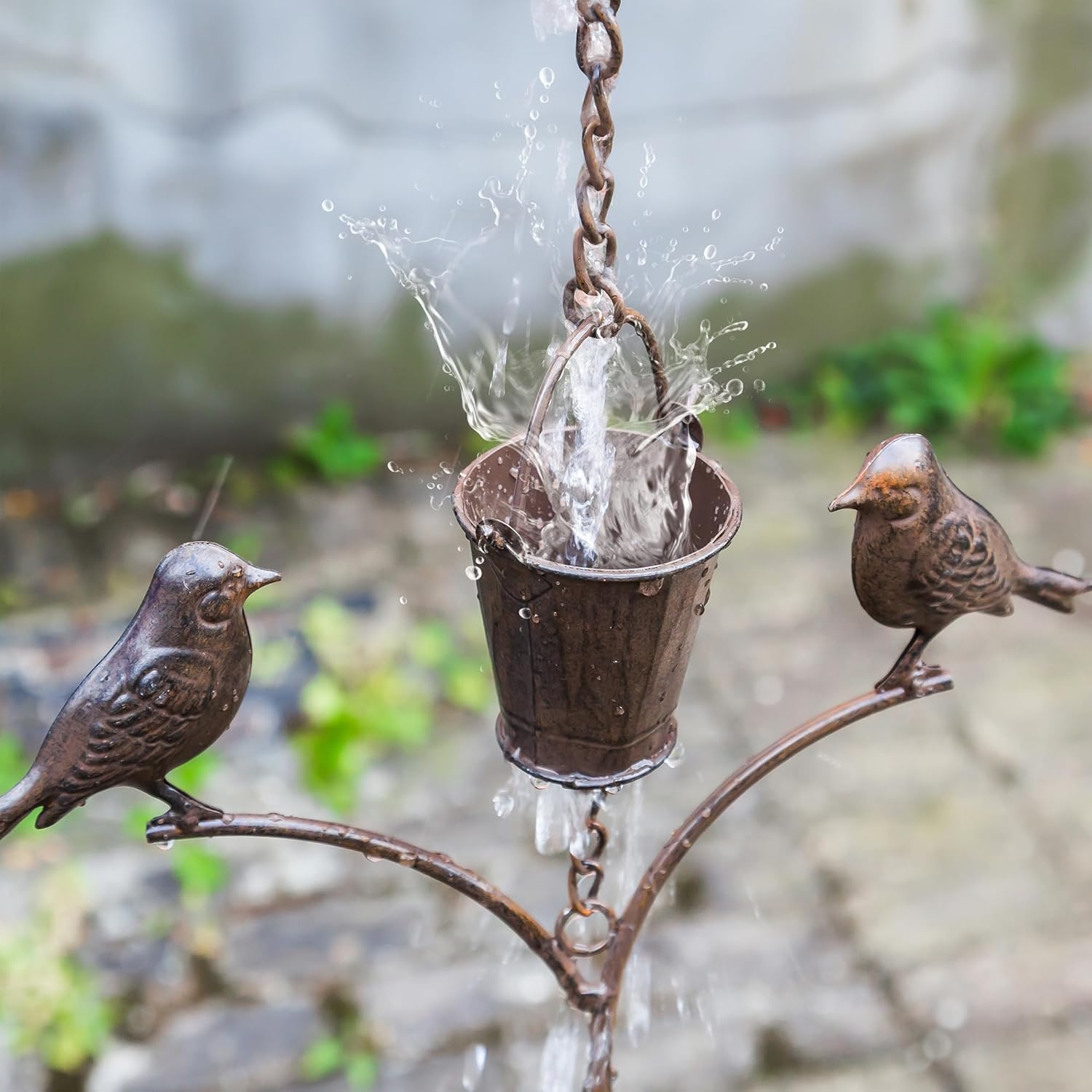 - 【Beautiful design】Overall antique design, each pair of birds guards a bucket from head to tail, very beautiful and decent shape, the bottom of the thick bell makes the rain chain will not easily shake, keep the shape, and also make a melodious ringing sound when shaking. Beautiful rain chains hang from gardens, porches, gazebos, travel trailers, and front doors, and your friends will appreciate and praise the arrangement