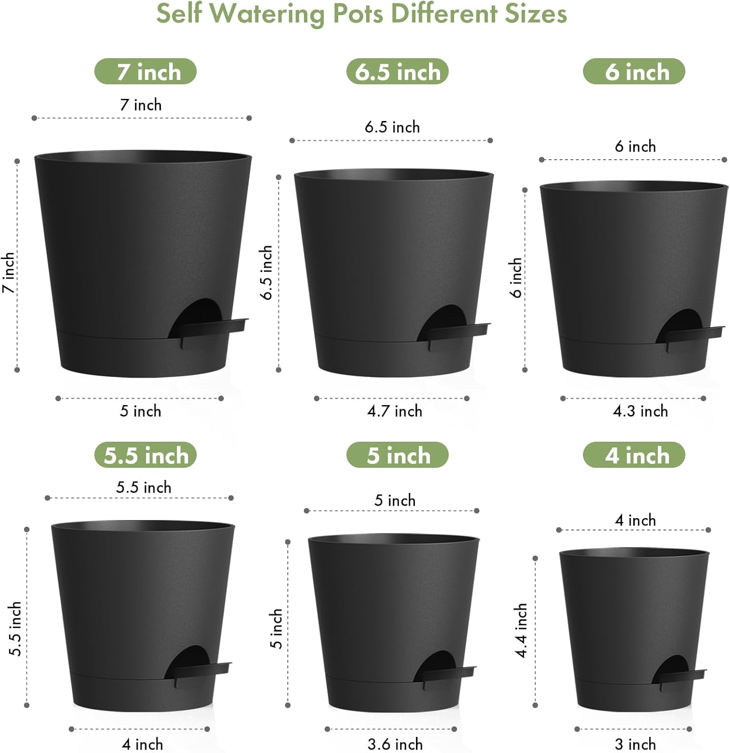 7/6.5/6/5.5/5/4 inch Self Watering Pots for Indoor Outdoor Plants, 6 Pack Plastic Flower Planters with Drainage Holes and Removable Saucers, Plant Pots with Wicking Rope, Modern Decor, Black