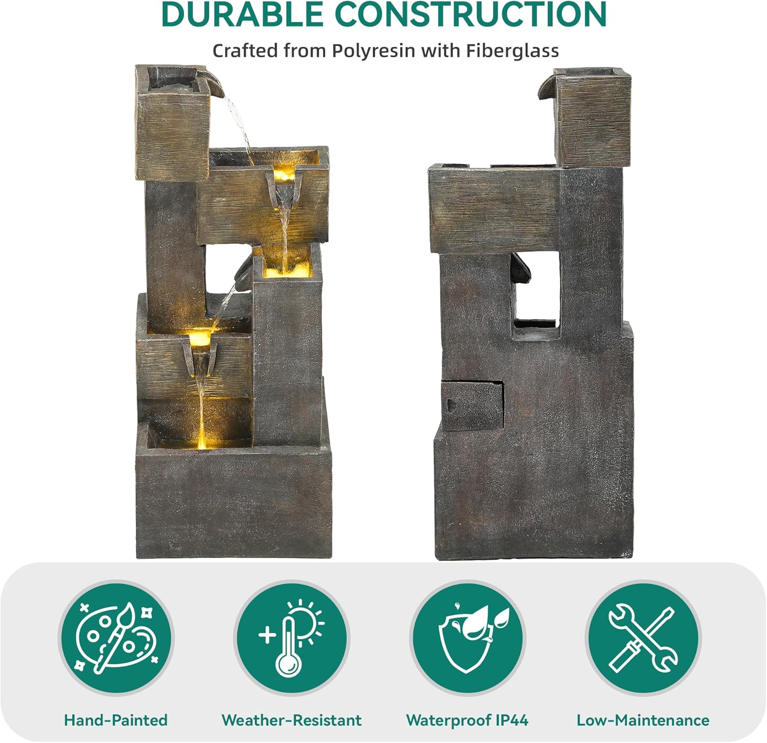 - DURABLE CONSTRUCTION: Made from premium resin and fiberglass, this outdoor fountain is weather, rust, and scratch-resistant. It offers lasting beauty with low-maintenance, making it a perfect addition to your outdoor décor year-round.