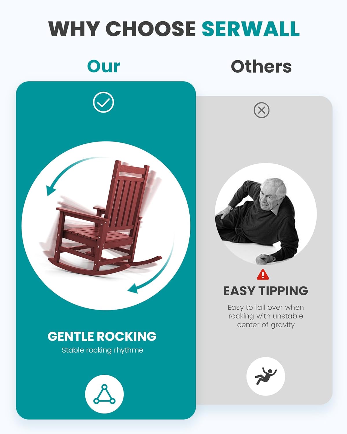 - Anti-Rollover: Engineered for stability, our outside rocking chair boasts a 4-point design with crossbars that evenly distribute weight, coupled with a precision-calculated rocking arc for safe, relaxing use.