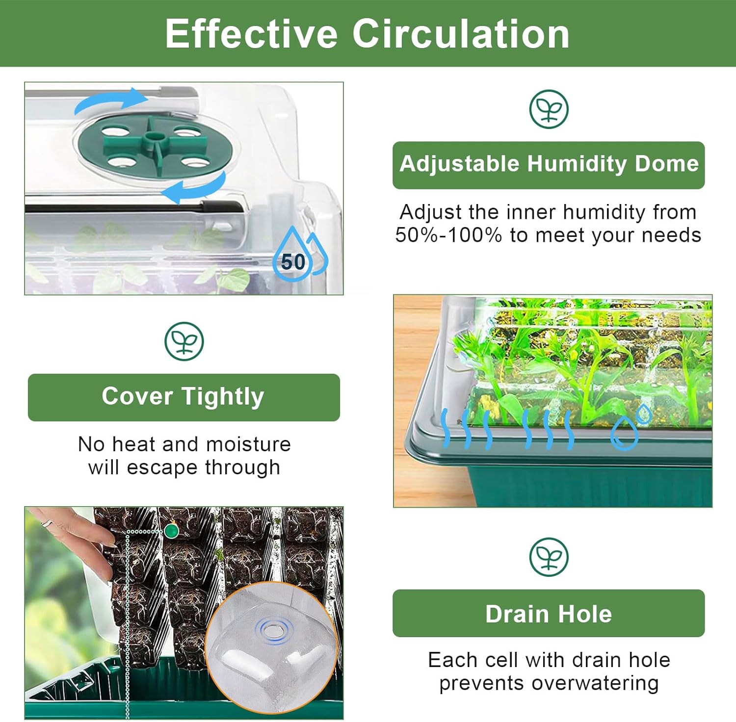 - 【Solid and Reusable Seeds Germination Trays】Seeding starter trays are made of high-quality plastic material, and clear tray design allow you can see the soil condition of seed. On each cell of the seedling tray, there is a leak hole to prevent over watering. the leak hole makes the soil to self-adjust to a better moisture level for the seeds.