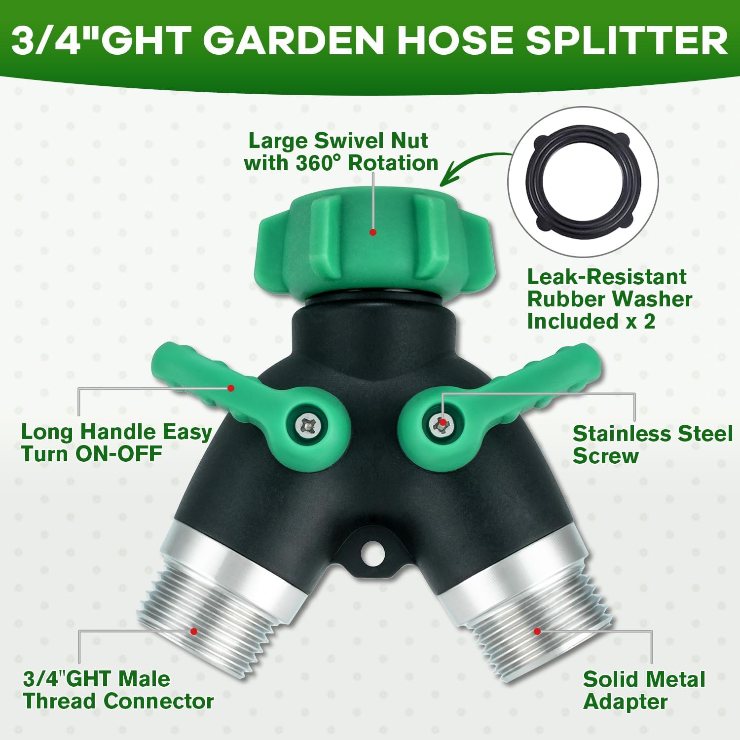 - 【Easy Installation】The hose y splitter with shutoff is threaded and securely connected, requiring no tools and easy to install. Hose splitter 2 way has a large rotary nut that can be turned 360°, and the hose dispenser can be quickly attached to any standard outdoor faucet.