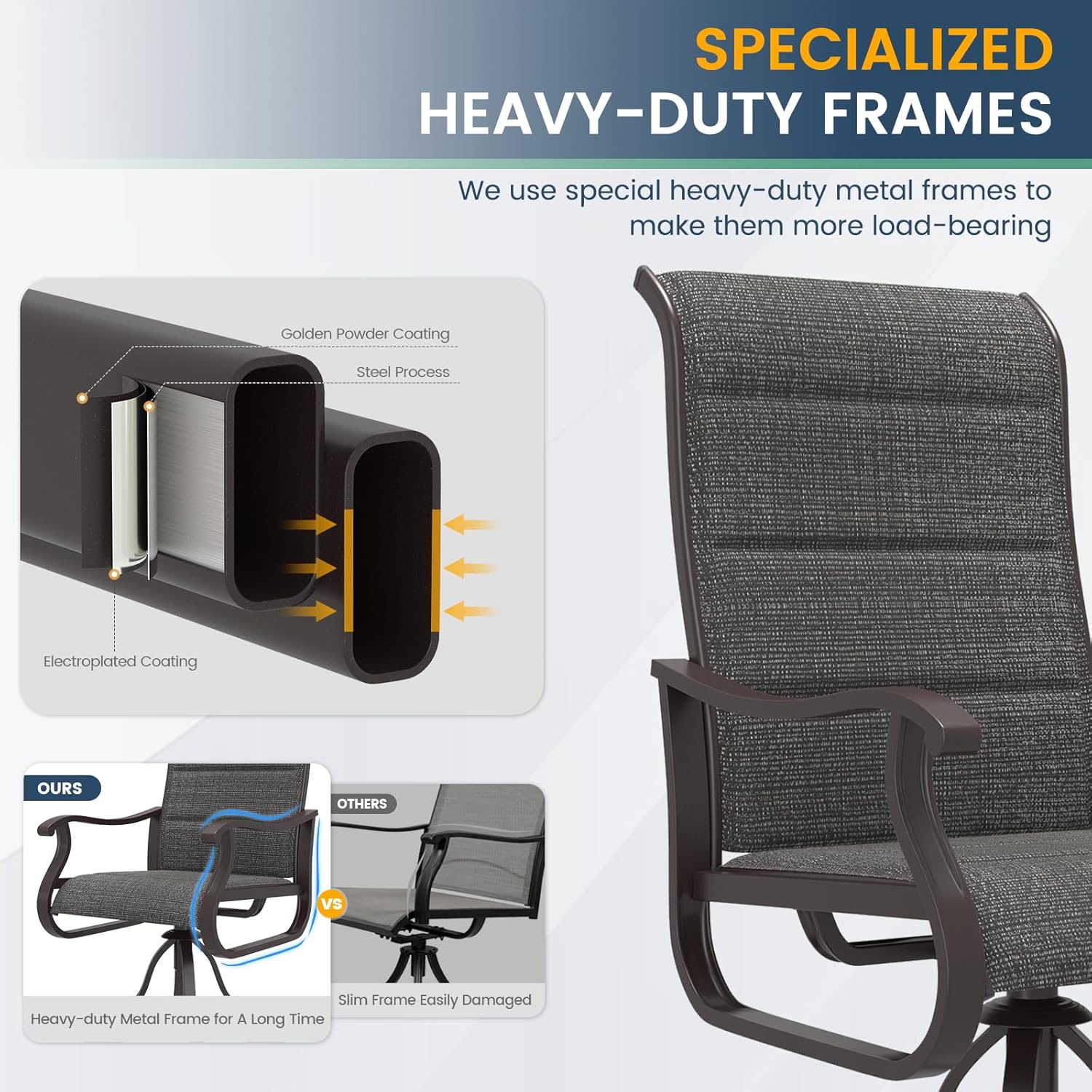 - ăSTURDY & WEATHERPROOF CONSTRUCTIONăOur patio furniture chair frame is made of powder coated high density metal that resists rust and corrosion and is stronger and more sturdy. Heavy-duty round swivel base gives the swivel rocker chair superb stability and can hold up to 400 pounds.