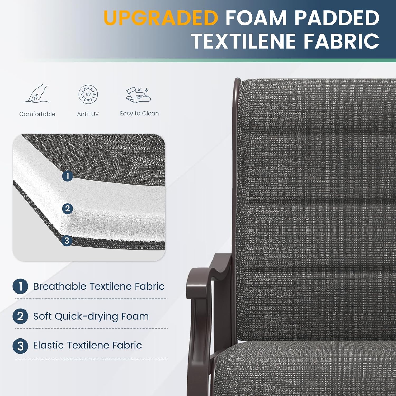 - ăCOMFORTABLE PADDED TEXTILENE FABRICăOur swivel patio chairs are made from a unique padded textile fabric that makes them softer and more comfortable than ordinary chairs while ensuring good breathability. You'll love the soft touch and the comfort of sitting for long periods of time without pains!