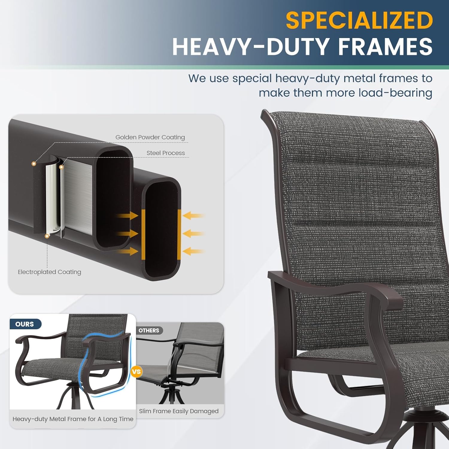 - 【COMFORTABLE PADDED TEXTILENE FABRIC】Our swivel patio chairs are made from a unique padded textile fabric that makes them softer and more comfortable than ordinary chairs while ensuring good breathability. You'll love the soft touch and the comfort of sitting for long periods of time without pains!