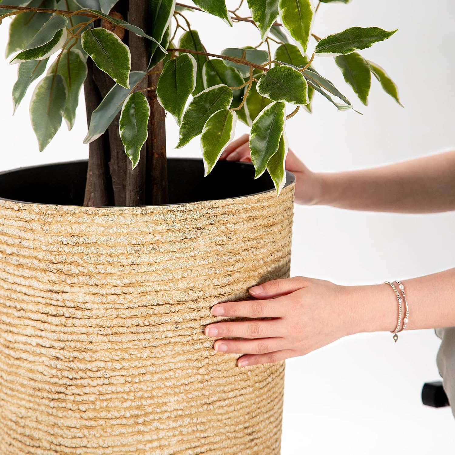 - The whole flower pot is made of polypropylene plastic, which solves the problem of fragile ceramic and heavy weight. With a textured beige faux stone finish, these round planters combine rustic elegance with durability, making them less prone to scratching or cracking. Perfect for yard planting, front door display, or year-round indoor use.