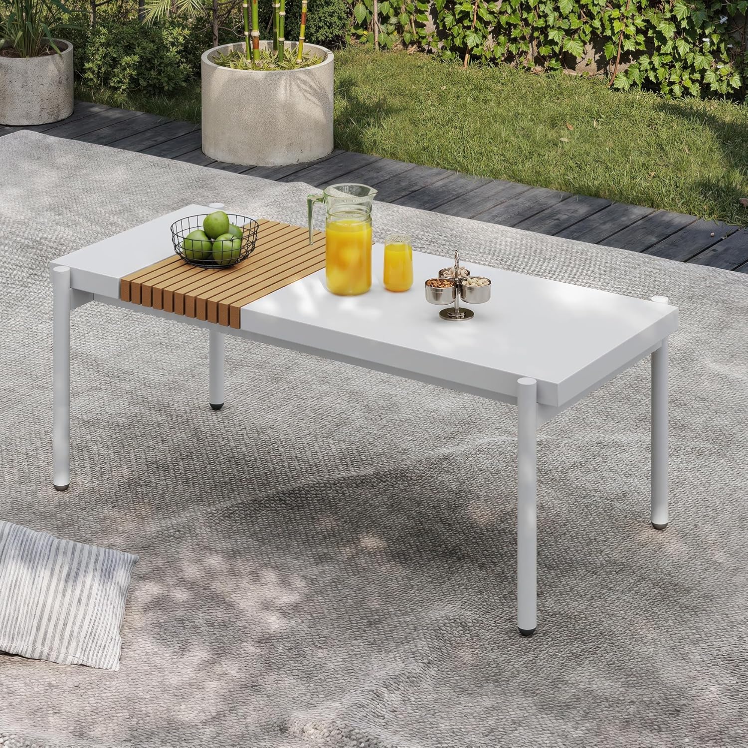 Sundale Outdoor Modern Metal Outdoor Coffee Table with Slatted Wood-Look Tabletop Design, Weather-Resistant Patio Side Table for Garden, Balcony, Poolside(White)