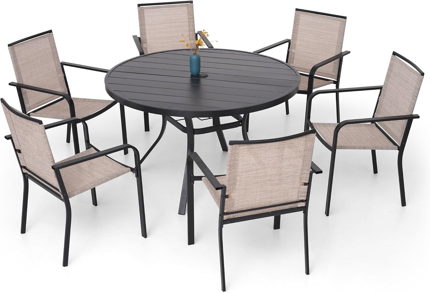 - COMPLETE SET: Outdoor dining set includes a round table and 6 matching chairs for a comprehensive patio furniture solution
