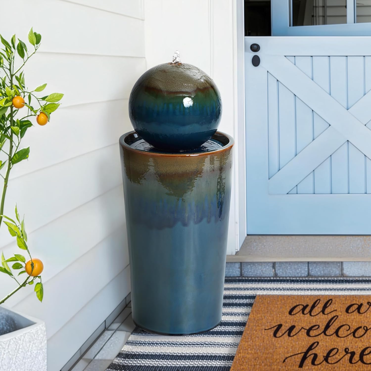 LuxenHome 30" Water Fountain Outdoor and Indoor, Glazed Blue Bubbling Sphere Ceramic Garden Outdoor Water Fountain, Elegant Modern Waterfall Garden Decor for Patio, Lawn, and Backyard