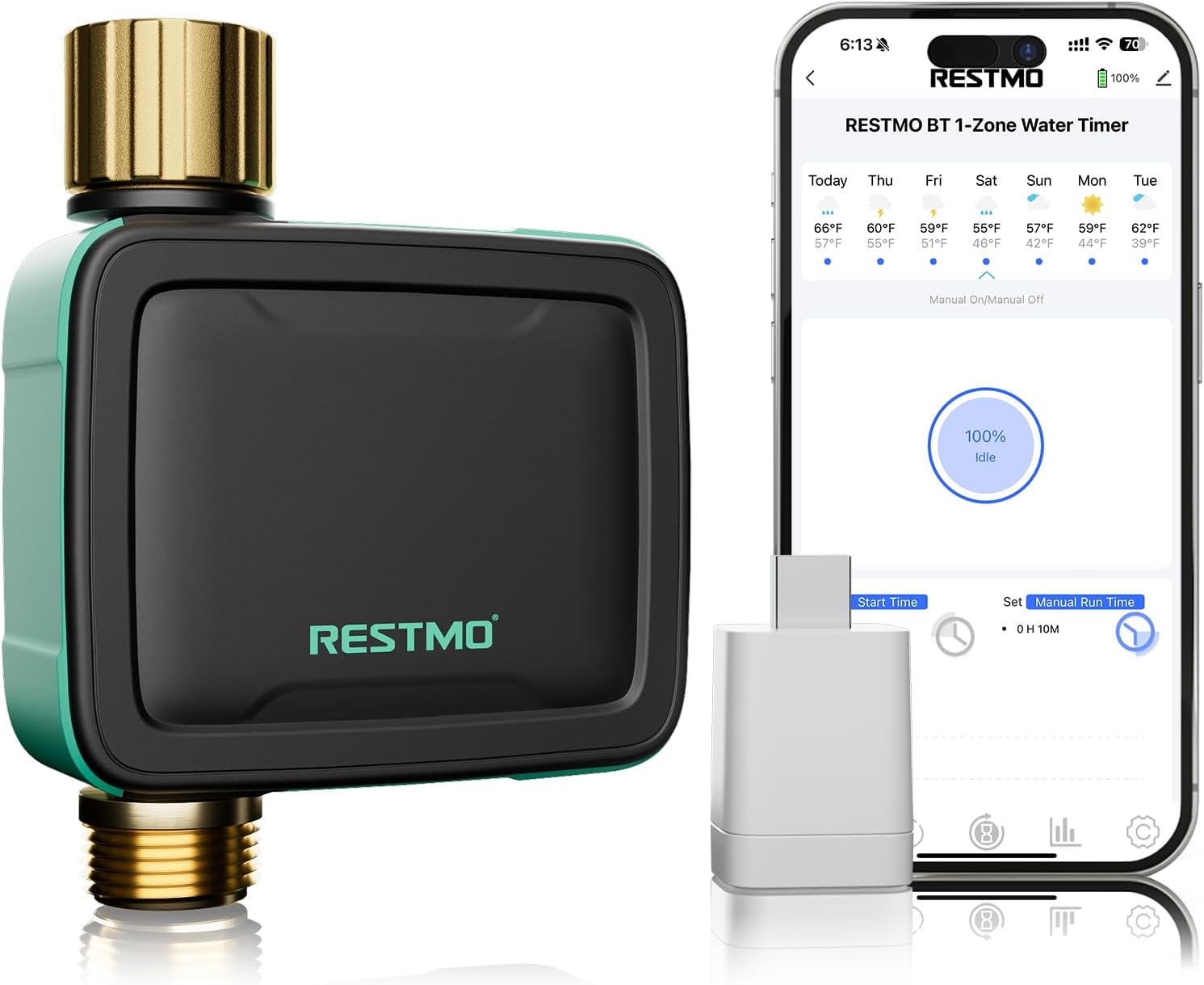 RESTMO Smart Sprinkler Timer with Flow Meter, Water Timer for Garden Hose, Brass Inlet & Outlet, Automatic Lawn & Yard Irrigation Watering System, APP Remote Control (2.4Ghz WiFi Connection)