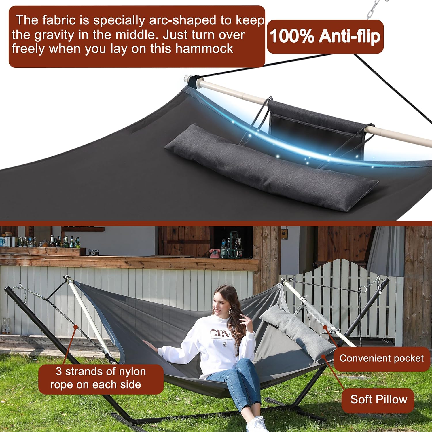 - ✯100% ANTI-FLIP OVER DESIGN: The latest exclusive design is different from other traditional hammocks that have ropes pulling the fabric in the middle. But TegerDeger directly removed all the middle ropes of hammock, giving the fabric a special curvature. This special design ensures that the hammock will not easily flip over, and you can even turn around freely on the hammock. Especially friendly to older people, feel free to give this as a gift to your parents.