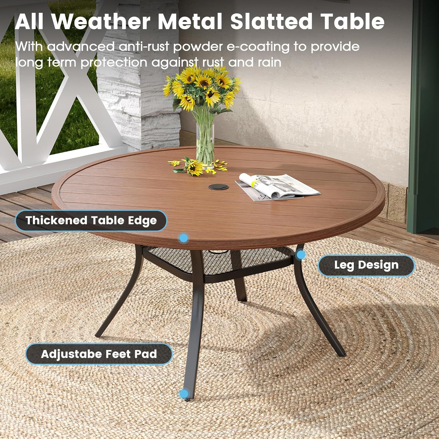 DIFY 48" Round Patio Dining Table for 6, All Weather Round Outdoor Metal Dining Table with 1.57" Umbrella Hole, Perfect for Backyard Lawn Garden, Walnut