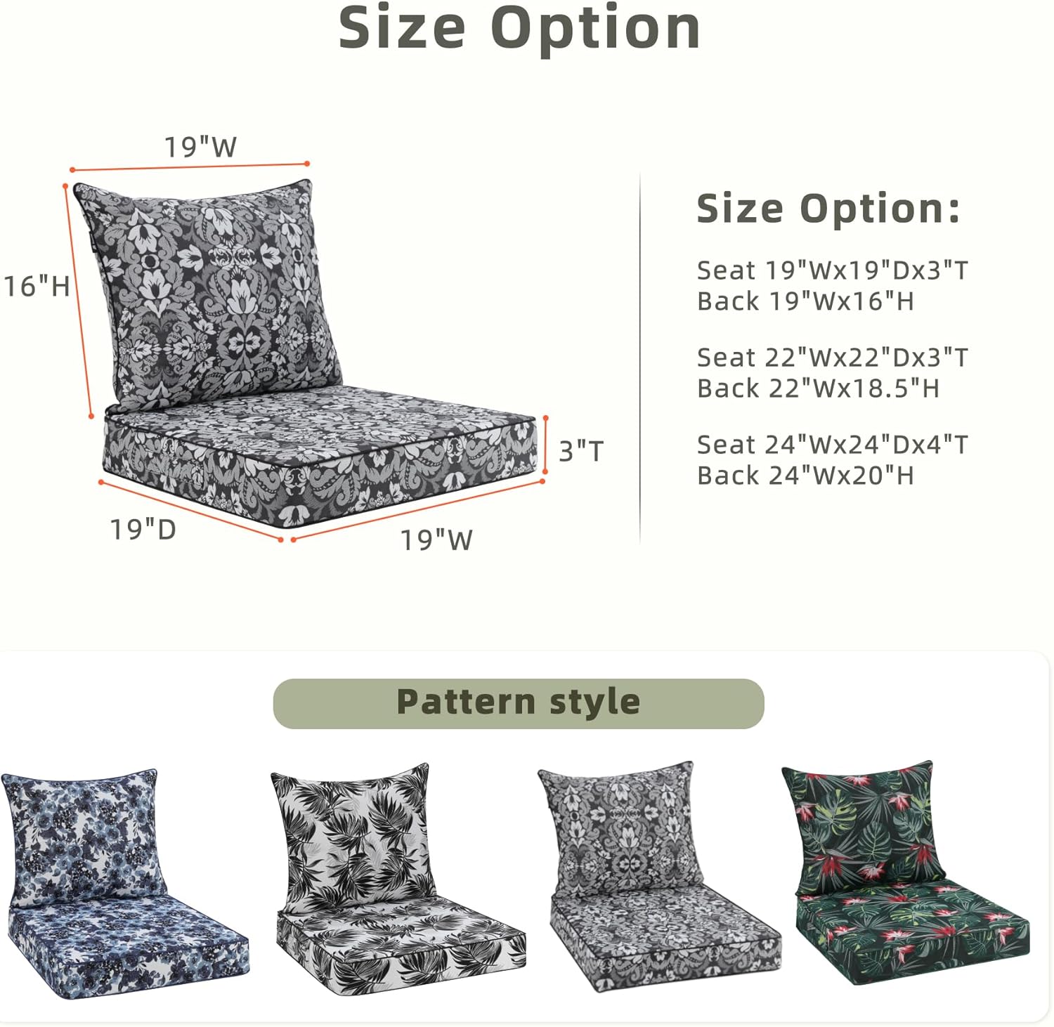 - Size Selection - Set includes 1 seat cushion measuring 19” W x 19” D x 3” T and 1 back cushion measuring 19” W x 16” H. ( The size description is only for the cushion size, accurately measuring the dimensions of your furniture's seating area in advance, make sure the cushion size fits your furniture ).