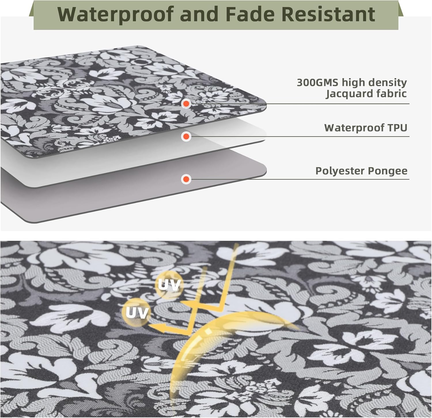 - Multiple Waterproof Cushions: This outdoor furniture seat cushion is made from 300GMS high density polyester fabric, waterproof TPU cover and sponge fabric from the outside to the inside, making the mat waterproof and durable. It also features a hidden zipper to prevent water from seeping through the zipper, enhancing the waterproofness of the product.