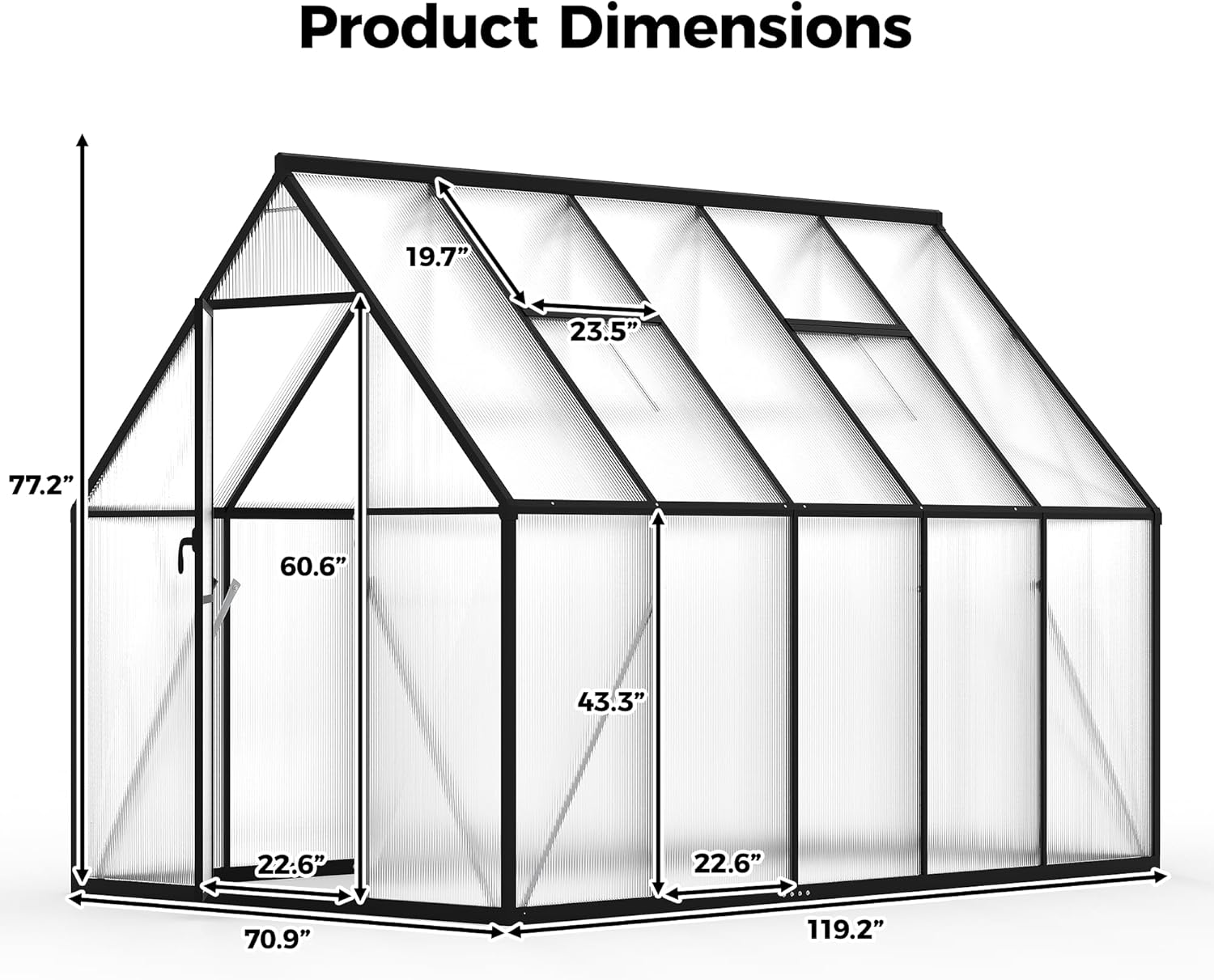 - 【Dimension】Overall size:70.9"W x 119.2"D x 77.2"H. Door size:22.6"W x 60.6"H. Roof Vent size:23.5"W x 19.7"H