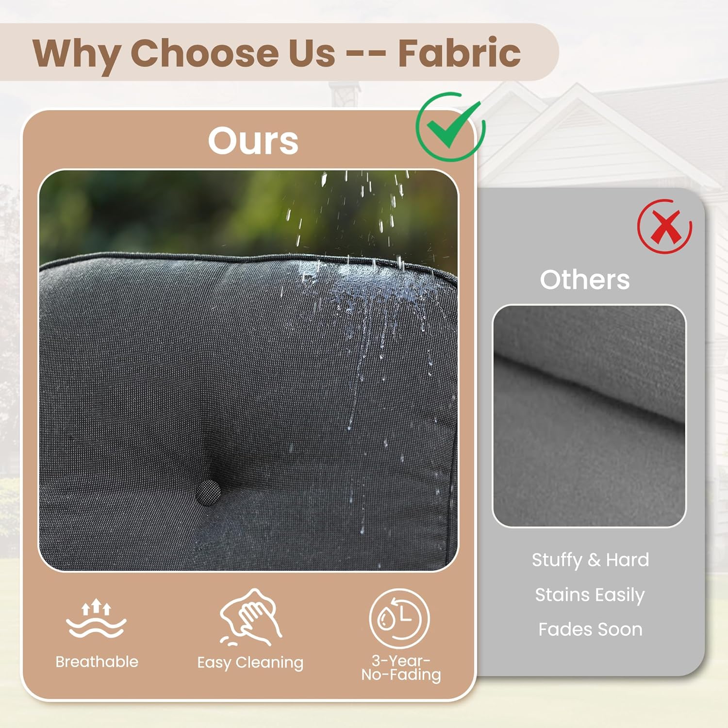 - Texture Woven Fabric: Cushions are covered by yarn dyed woven fabric, the yarns are dyed and UV treated before woven into fabric for out door fading resistant and water repellent. Looks and touches with high-end woven texture. No more worry about getting cheaply made thin print fabric. Detachable & washable
