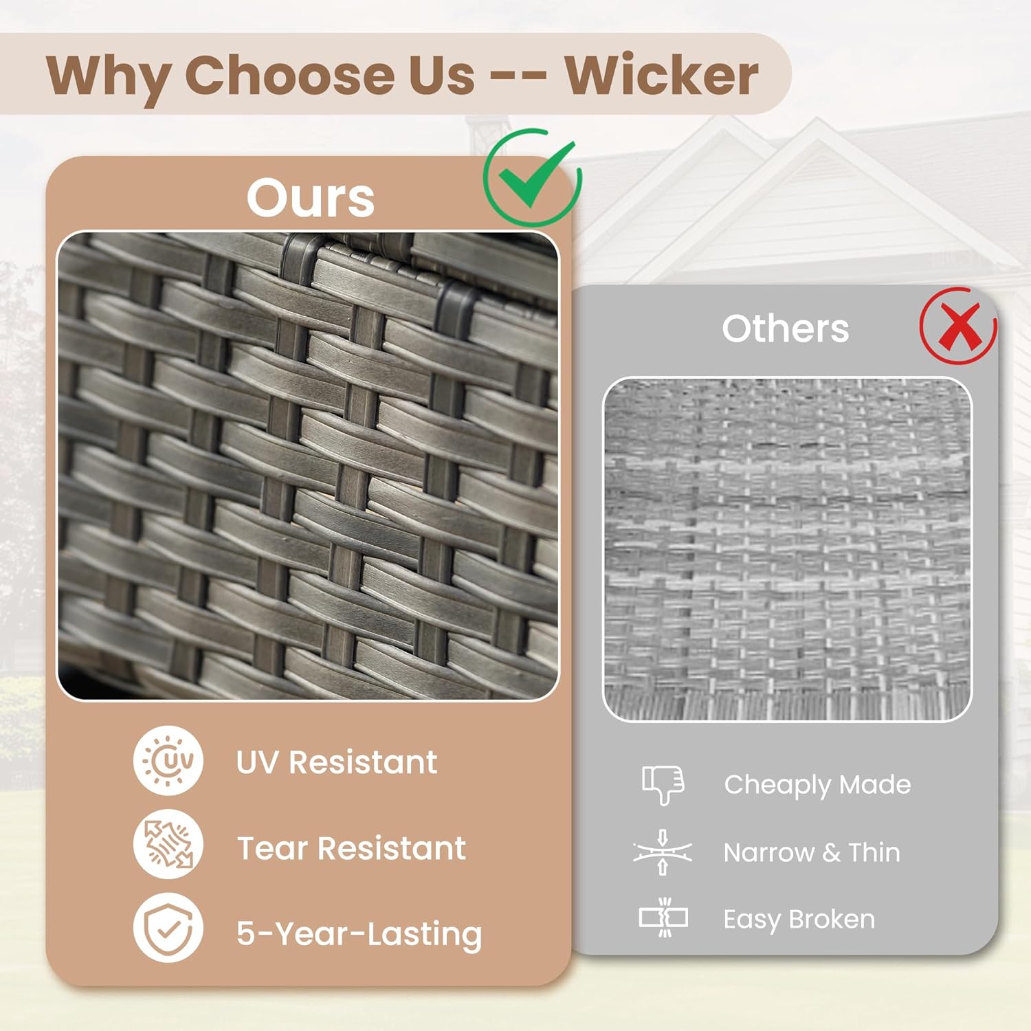 - All Weather & Durable: Selected anti-ageing treated thicken PE wicker rattan for UV resistant, wear resistant and all weatherproof. 3D strengthen and widen design for extended service life,twice service life as others