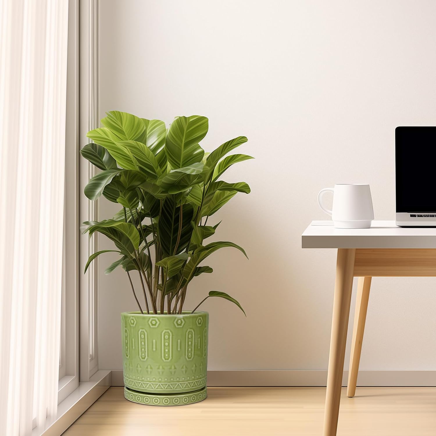 Ceramic Pot for Plants - 10 Inch Indoor Plant Pots with Drainage Holes and Saucer, Boho Round Planter Outdoor, Decorative Large Planter for Flower, Living Room Decor, Garden Gifts, Green