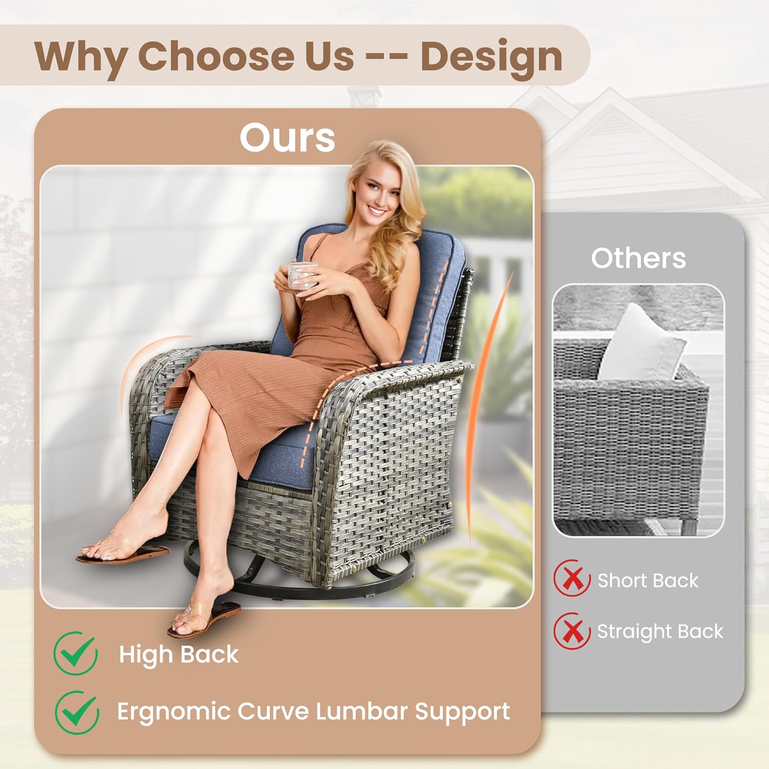 HOOOWOOO Patio Furniture Set,3 Pieces Outdoor Conversation Set,All Weather Wicker High Back Swivel Chairs Bistro Set with Side Table,Denim Blue