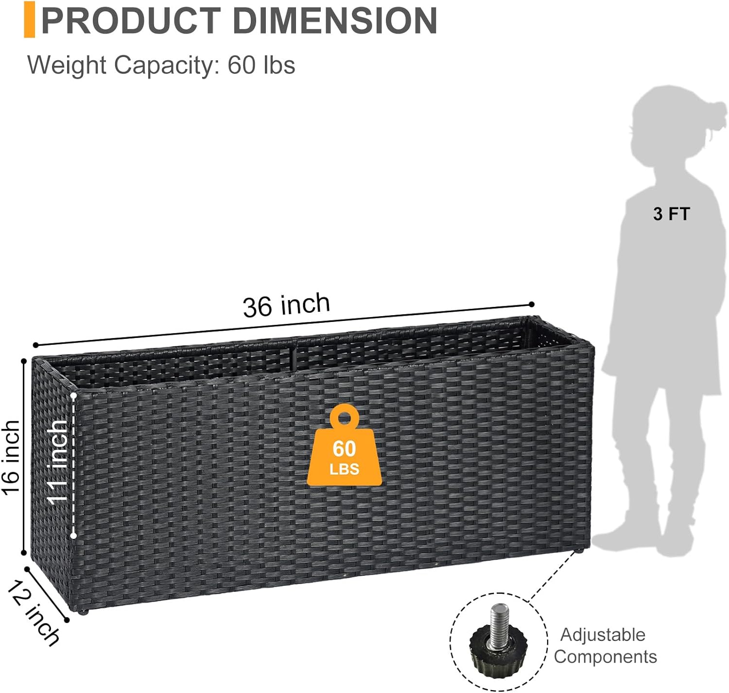 - Product Details - Dimensions (LxWxH) Plant pot: 36 x 12 x 16 inch Material: PE rattan, Powder-coated Steel, Plastic , Adjustable Feet