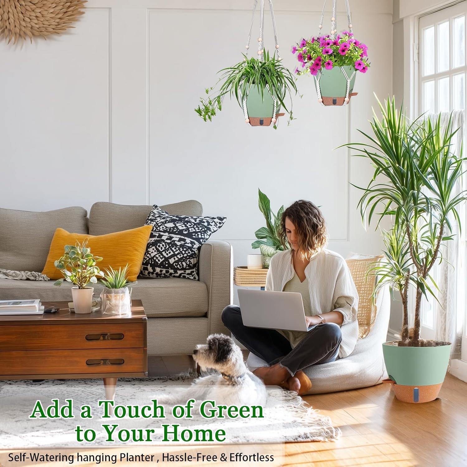 - 【Smart Self-Watering System】 Our hanging plant pots come with a REMOVABLE RESERVOIR TRAY that stores 7-10 day water supply. Absorbent cotton ropes automatically deliver moisture to soil when needed - ideal for vacations or busy lifestyles. Spend less time watering hanging baskets for indoor plants!