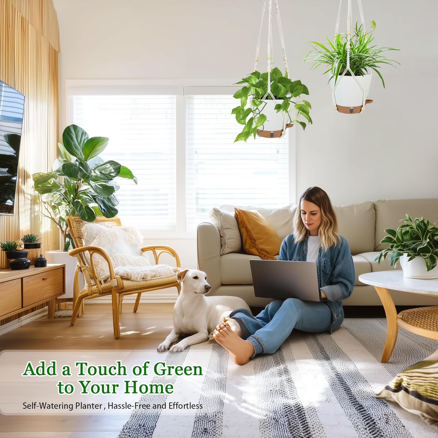 - 【Smart Self-Watering System】 Our hanging plant pots come with a REMOVABLE RESERVOIR TRAY that stores 7-10 day water supply. Absorbent cotton ropes automatically deliver moisture to soil when needed - ideal for vacations or busy lifestyles. Spend less time watering hanging baskets for indoor plants!