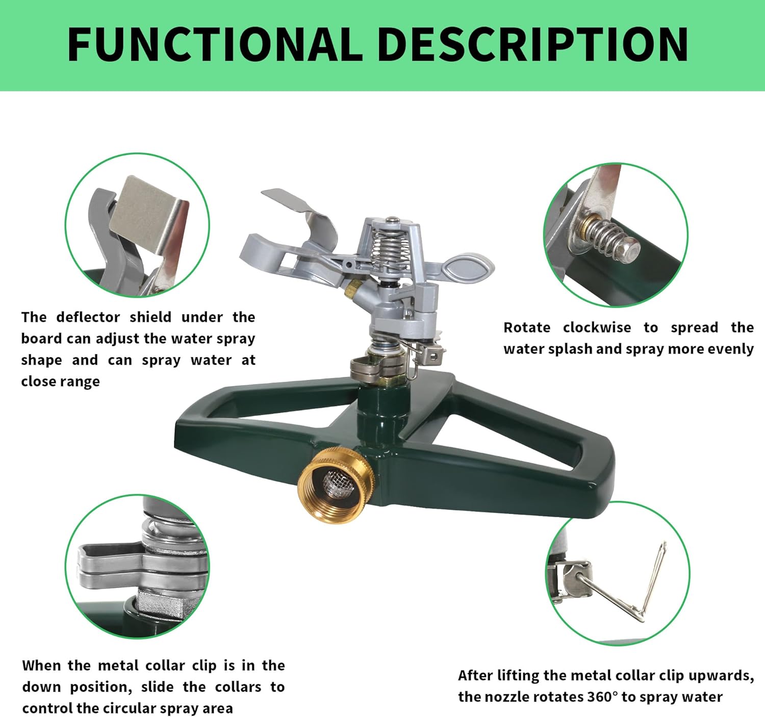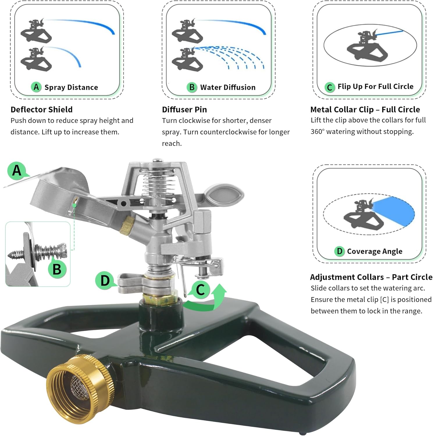 - 【Durable 100% Metal Construction for Long-Lasting Use】 Both the base and the head of our impact sprinkler are crafted from premium zinc alloy, ensuring exceptional durability and resistance to rust, corrosion, and wear. Designed to withstand harsh weather conditions and frequent use, this 100% metal sprinkler guarantees years of reliable performance, making it the perfect choice for maintaining your lawn and garden.