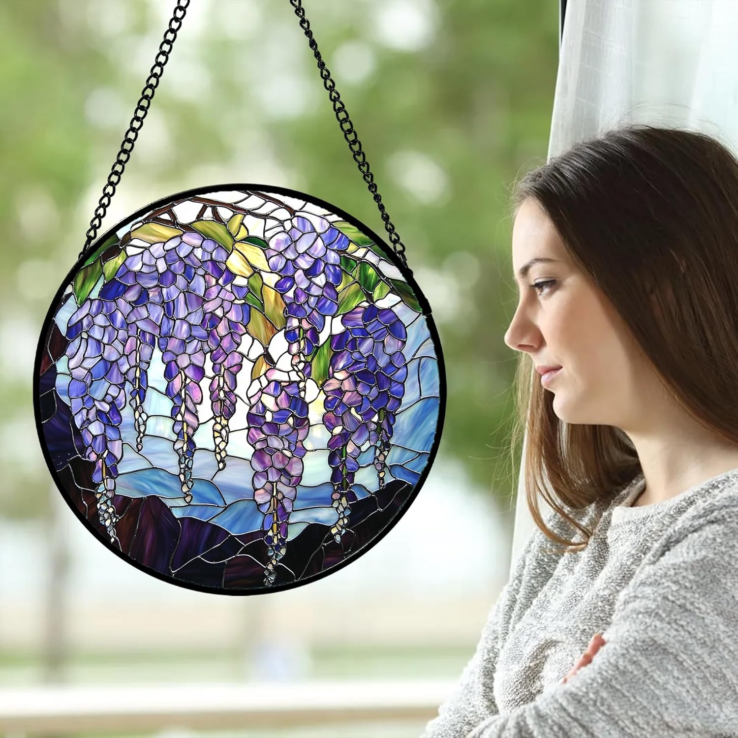 Stained Glass Window Hanging, Purple Wisteria Flowers Suncatcher for Doors Window Home Plant Sun Catchers Decoration Mother's Day Birthday Gifts for Women, Men, and Mom 6.3x6.3 in