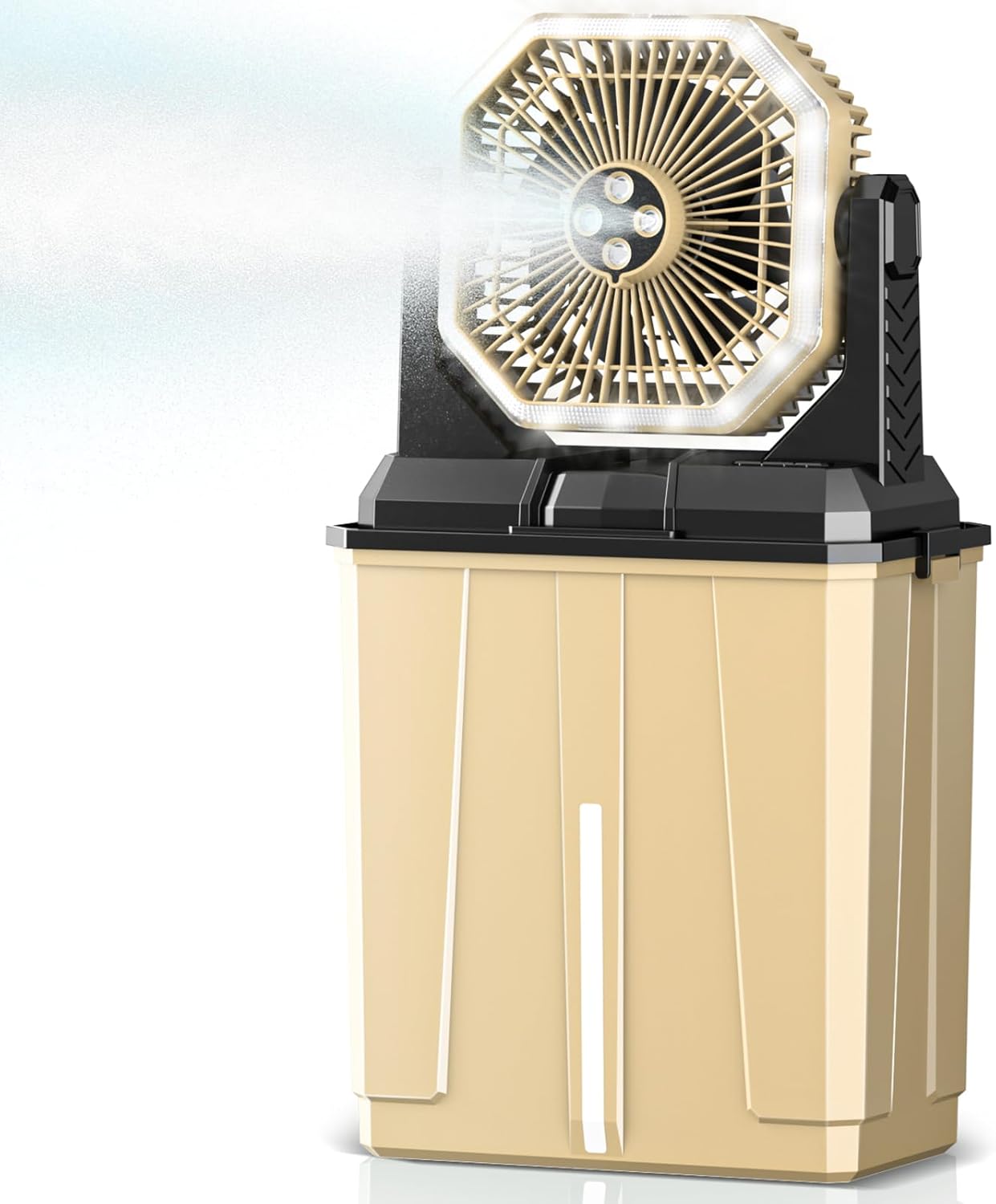 - ăAll purpose outdoor equipment: spray+fan+emergency light in oneă COOLICE industrial bucket spray fan is a combination of 8L large capacity water tank, 24000mAh rechargeable battery and three LED lighting. Its folding design is easy to use. Whether it's high-temperature work, camping adventures, or power outage emergencies, this misting fan is your "mobile cooling station"+"safety lighthouse"!
