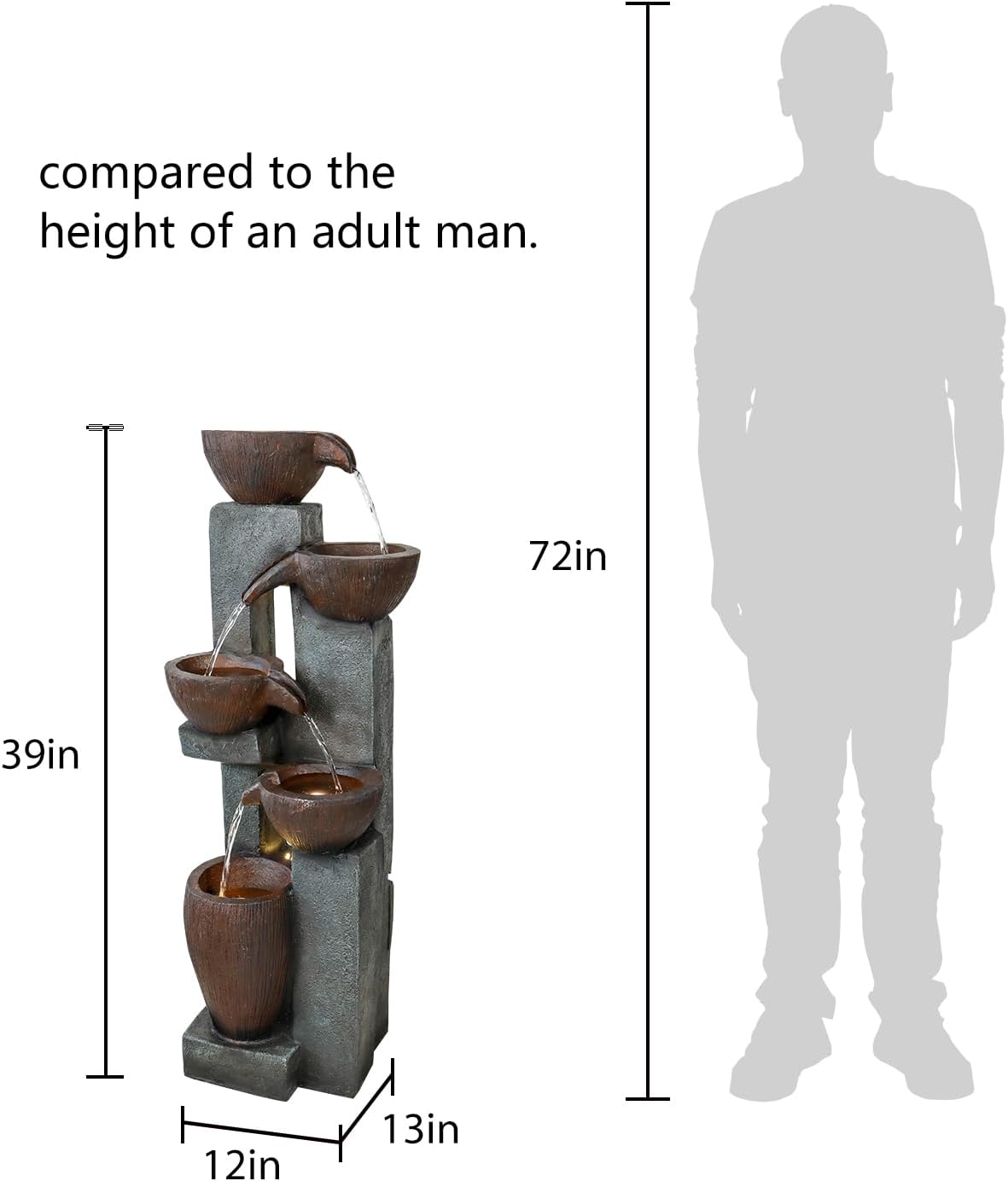 - With the suitable size 13" L x 12" W x 39" H for indoor or outdoor décor. The modern cascading bowls water fountain will add instant beauty to your surroundings.