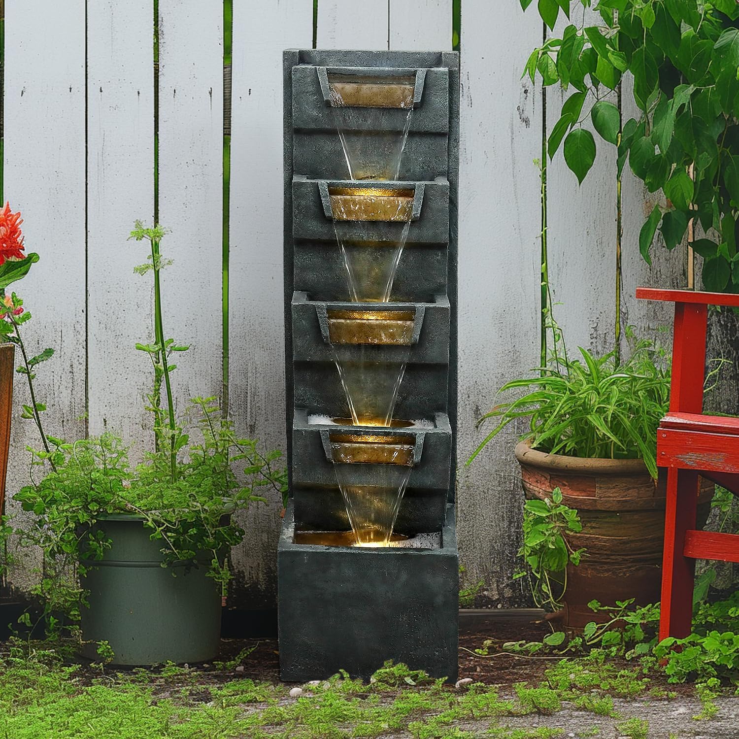 SunJet 4-Tiers Modern Cascading Indoor/Outdoor Fountains and Waterfalls with LED Lights - 39.3" High Large Water Fountain for Garden, Patio, Yard, and Deck Decor - Relaxing Water Fountain Outdoor