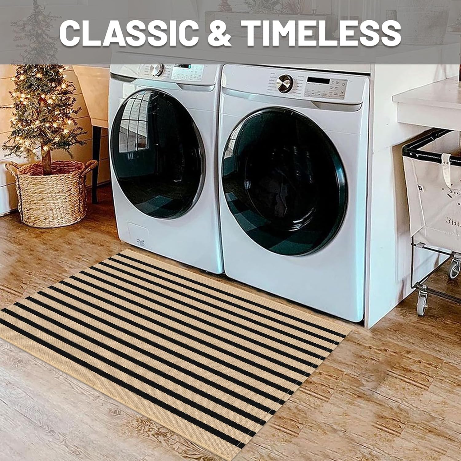 - Easy to Clean: This tan and black striped rug is simple to maintain with machine wash or vacuuming to remove dirt. The rug is sturdy and can be tumble dried on low. Keep your door rug fresh and clean with minimal effort. NOTE: Cotton rugs normally shrink slightly after washing