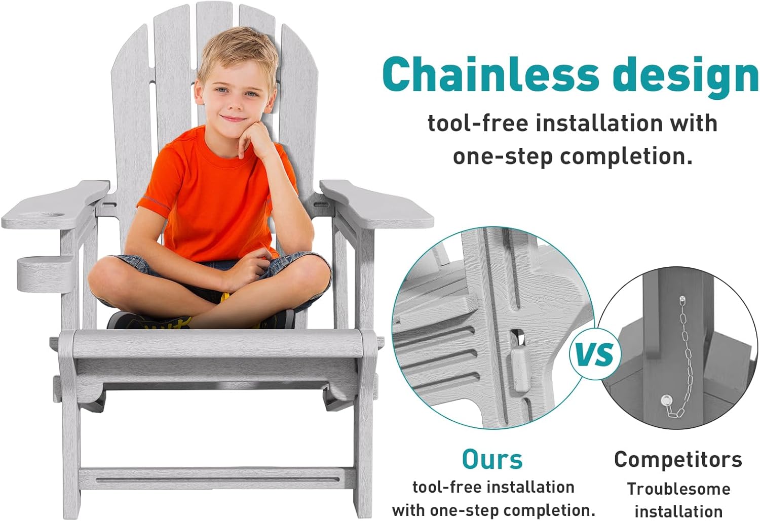 - ăTool-Free AssemblyăSkip the toolbox! Our ingenious adirondack chairs features a revolutionary screw-free design with plenty of pre-installed components.The chair simply follow the intuitive steps and be lounging in total comfort in under 15 minutes.