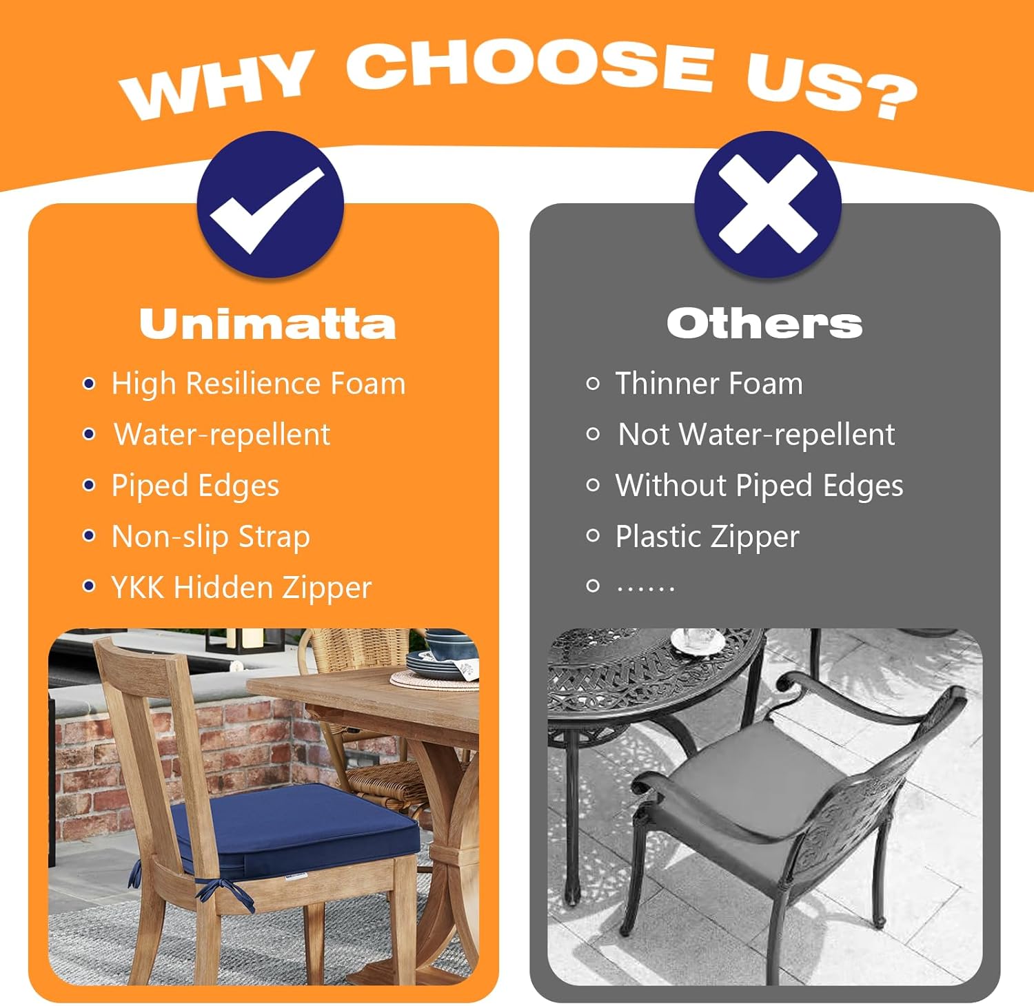- 【High Resilience Foam】 The Unimatta chair cushions are filled with high-quality 100% foam, high-density sponge offers excellent support and long-lasing comfort. Whether you're enjoying a sunny afternoon or a cool evening, this cushion will keep you cozy.