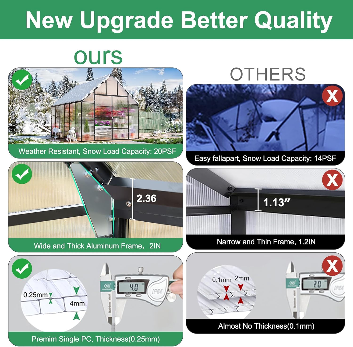 - 🌻Sturdy Frame: Our greenhouse kit boasts a robust rust-resistant aluminum frame designed to withstand various weather conditions. 2 skilled enthusiasts can assemble this greenhouse kit within just 4-6 hours. Introducing patented technology, Easy assembly, saving you 50% of your time. Gone are the days of tedious setups. With a simple push and locking screw, our Quick Connect ensures a reliable, secure, and swift link-up. It can also support snow loads of up to 20PSF.
